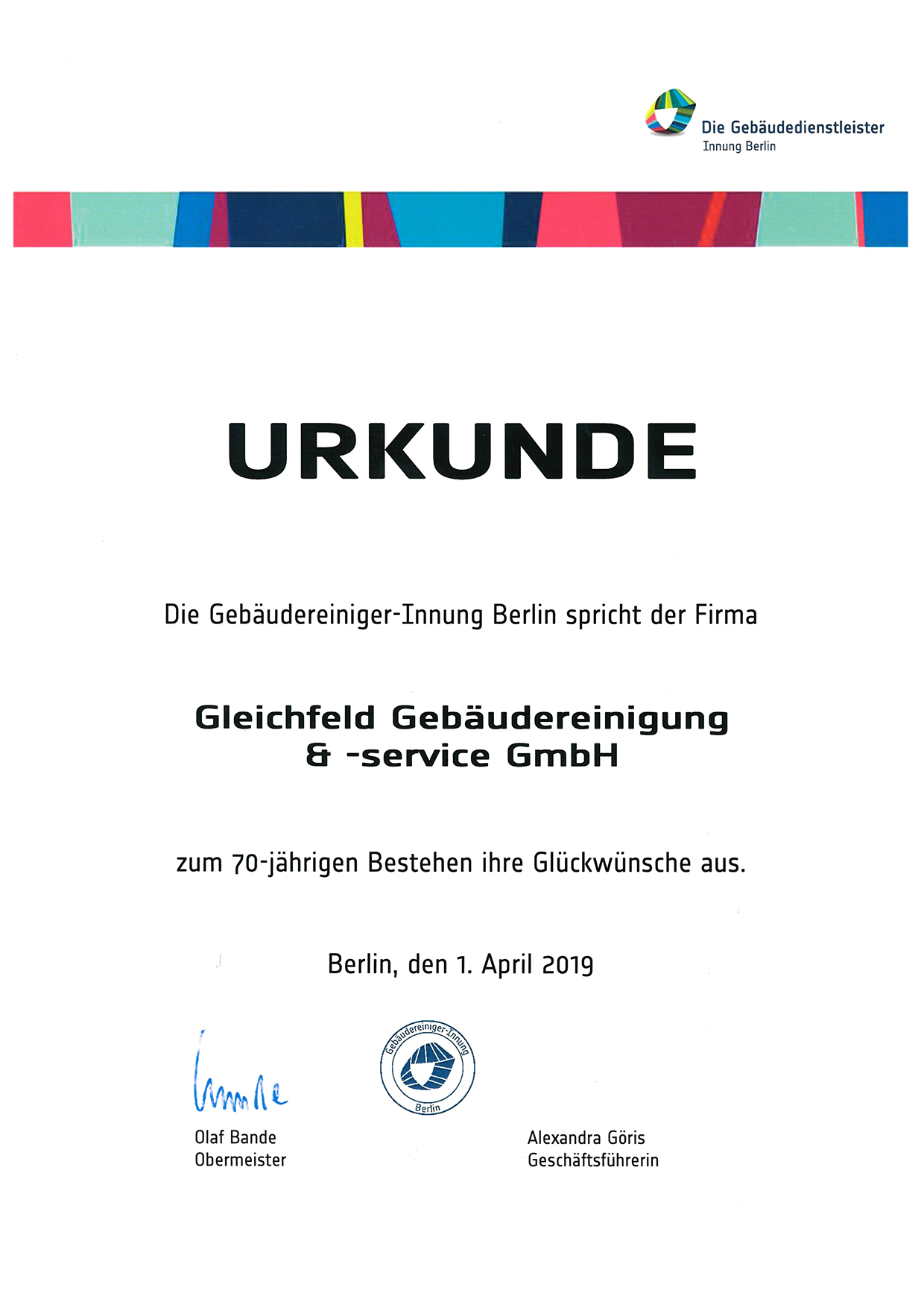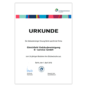 Mehr InfosDie Gleichfeld Gebäudereinigung wurde 1949 durch Rudi Gleichfeld in Berlin gegründet und ist bis heute ein familiengeführtes Unternehmen. Unsere Dienstleistungen tragen seit mehr als 50 Jahren zur Sauberkeit und zum Werterhalt von Immobilien und Anlagen bei. Den langjährigen Erfolg verdanken wir unserer konsequenten Kundenorientierung, hohen Qualitätsansprüchen, Zuverlässigkeit und nachhaltiger Personalentwicklung.